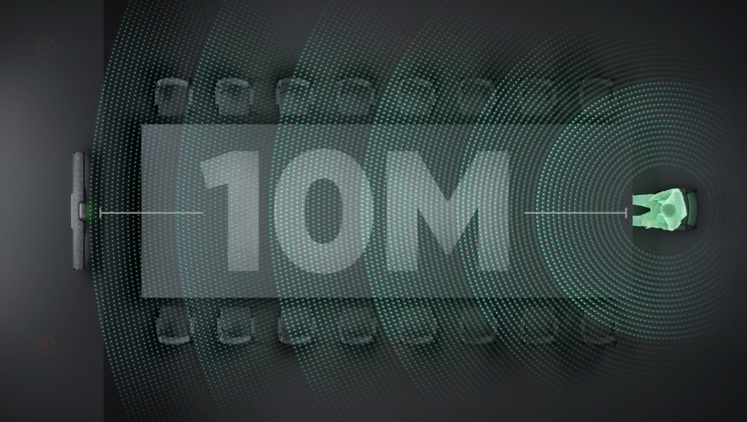 搭载基于神经网络的智能 3A 算法,可对会议室周边噪音及回声进行消除,增益人声,实现 10 米超远距离无差别拾音。并结合双目检测技术,检测人物距离,自动调整 EO 曲线以还原不同距离下的真实音色,让每个人的声音都如面对面沟通般自然。